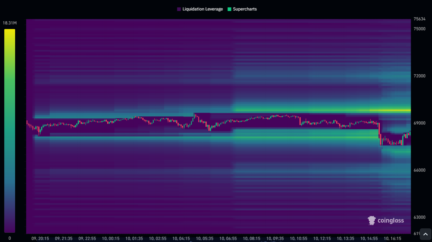 Coinglass’s Binance BTC/USDT Liquidation Heatmap signals an impending Bitcoin liquidation event between $68,000 and $69,000.